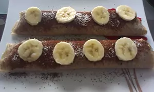 OPIS POSTOPKA: Iz sestavin za palačinke zmešamo gladko maso, ki jo pustimo počivati 30 minut, nato na kokosovem olju spečemo palačinke Za rožičev namaz najprej zavremo vodo. Nato dodamo rožičevo moko, kakav in stevio. Pokuhamo, da nastane gosta krema. Če želimo bolj tekočo, dodamo več vode. Palačinke nato namažemo z rožičevo kremo, nanje položimo na kolobarje narezano banano in zavijemo. Okrasimo z grenkim kakavom in banano.