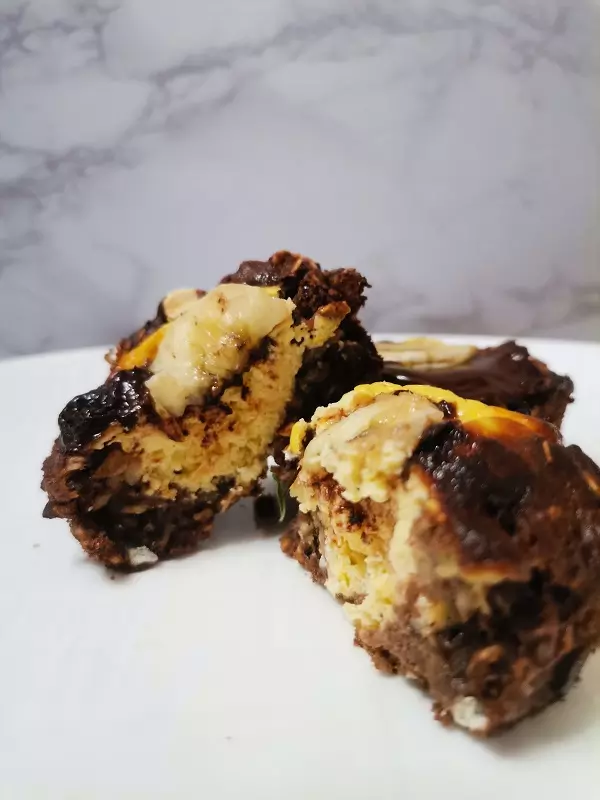 7. Ko so naši kolački pečeni na njih položimo koščke čokolad in rezine banan. Damo v pečico za cca. minutko, da se čokolada lepo stopi.