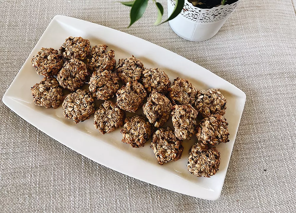 2. V srednje veliki posodi zmešamo ovsene kosmiče, zmečkane banane, arašidovo maslo, kokosovo olje in med (ali agavin sirup).