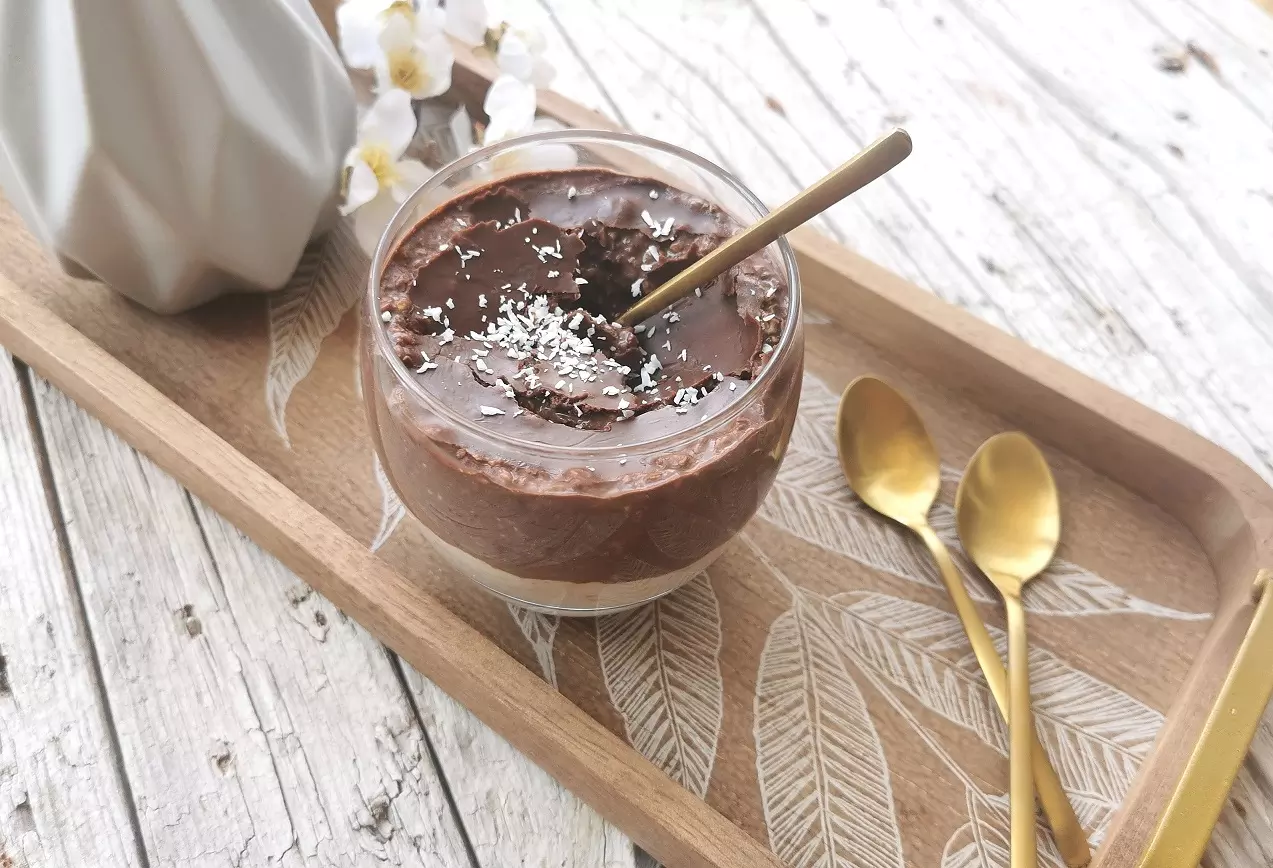 OPIS POSTOPKA: Vse sestavine razen kakava in čokolade zmešamo v posodi. Okus je boljši, če kokosovo moko pred pričetkom rahlo prepražimo, da zadiši. Polovico mase razdelimo v dva kozarčka. Nato v preostalo maso dodamo kakav, premešamo da se poveže in preostanek mase razdelimo v oba kozarčka, kamor smo že razporedili prvi del mase. Čokoladi (prib 20 g na kozarček) dodamo malo kokosovega olja in jo raztopimo. Enakomerno jo razporedimo v oba kozarčka. Če želimo, da čokolado pred postrežbo počimo (udarimo nanjo z žlico) mora biti sloj čokolade res zelo tanek. Tako pripravljeno kašo damo na hladno za vsaj tri ure.