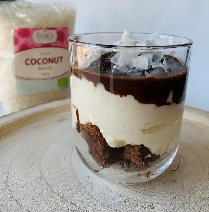 Ohlajen biskvit nalomimo v kozarček. V skodelici zmešamo mascarpone, kokos in dve žlici mleka. V kozici zmešamo/stopimo skupaj sladko smetano, temno čokolado in čokoladno lešnikov namaz.