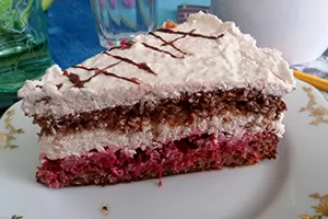 OPIS POSTOPKA: Rumenjake penasto stepemo skupaj s sladkorjem. Dodamo jogurt in rum, premešamo. Dodamo še moko, mlete mandlje in pecilni prašek ter vse dobro premešamo. Na koncu beljake stepemo v sneg in počasi dodajamo mešanici (vmešavamo na roke, ne z mešalcem). Biskvit vlijemo v model in ga pečemo približno pol ure na 180 stopinjah. Pečen biskvit prerežemo, prvo plast namestimo v model in ga prelijemo z mešanico toplega mleka (navadno, kokosovo ...) in ruma. Če imamo zamrznjene maline, jih segrevamo na majhnem plinu dokler se popolnoma ne odmrznejo, sladkamo po okusu, pustimo, da se ohladijo. Sveže le sladkamo in jih nekoliko pretlačimo (lahko jih le malo, če so vam všeč cele maline ali pa zelo, da dobimo kompaktno malinovo zmes). To zmes damo na prvo plast biskvita. Nadaljujemo s kokosovim nadevom (smetano stepemo in ji dodamo kokosovo moko po želji), nadeva dodamo le pol, sledi druga plast biskvita (ga navlažimo) in na koncu na drugo plast biskvita namažemo še preostanek kokosovega nadeva.