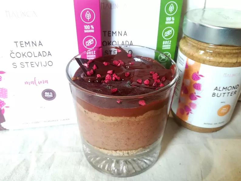 Za konec k preostali tretjini čokoladno-mandljeve kreme dodamo še 30 g temne čokolade in raztopimo na nizki temperaturi. Spet dodamo za četrtino žličke konjaka, zmešamo in prelijemo v kozarček. Okrasimo s temno čokolado z malinami in postavimo v hladilnik.
