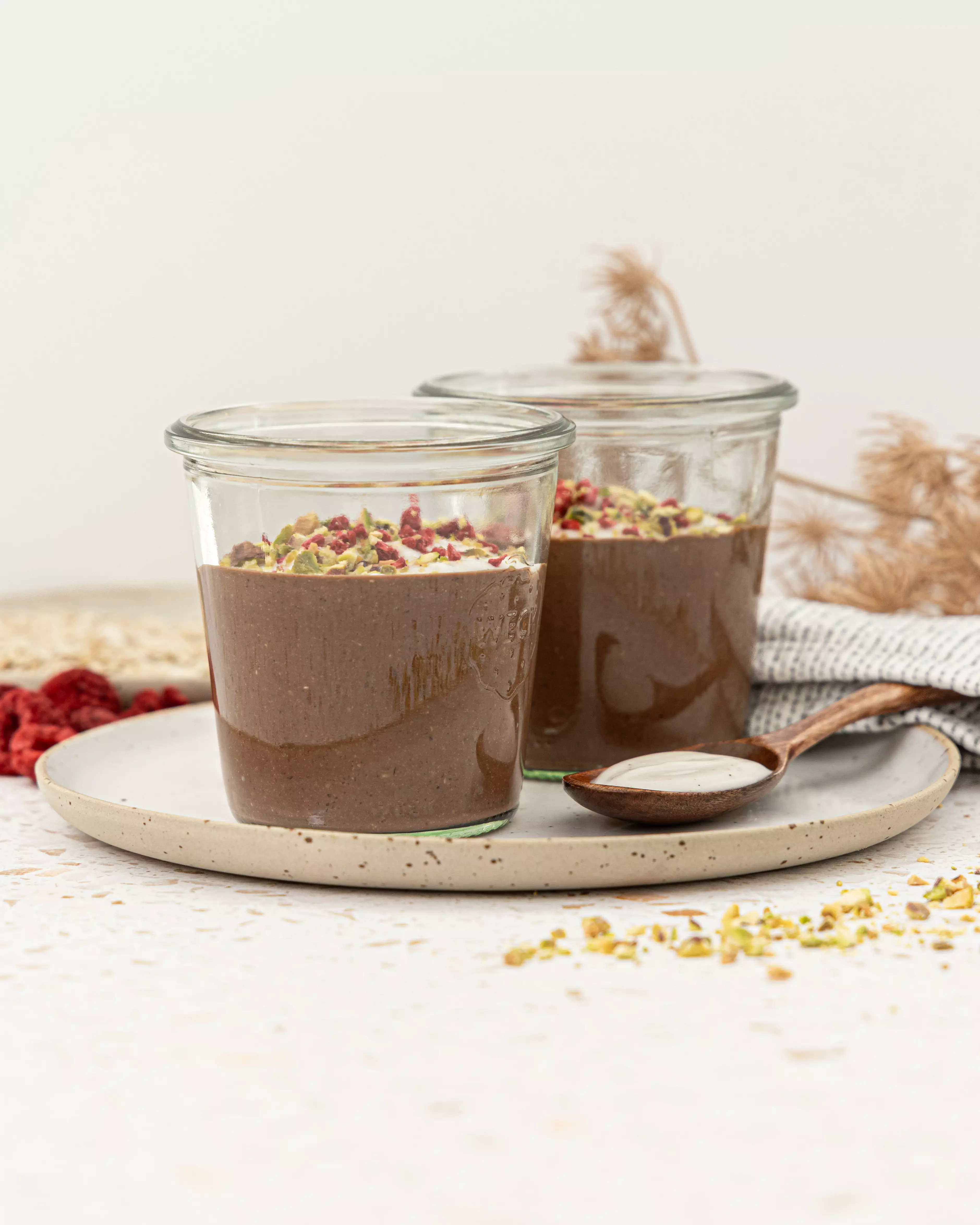 OPIS POSTOPKA: : V manjšo posodico dodaj ovsene kosmiče in jih prelij z vrelo vodo. Pusti jih stati okoli 5 minut. V posodo paličnega mešalnika dodaj pol banane, mleta lanena semena, kakav v prahu, javorjev sirup, rastlinski napitek, namočene ovsene kosmiče in vse skupaj dobro zmešaj. V srednje veliko posodo dodaj rastlinski kokosov jogurt in čokoladno ovseno mešanico. Vse skupaj dobro premešaj, nato pa maso porazdeli v kozarčke in jih postavi v hladilnik za vsaj nekaj ur. Postrezi še hlade, s kančkom rastlinskega kokosovega jogurta, narezanih pistacij in liforiziranih malin.