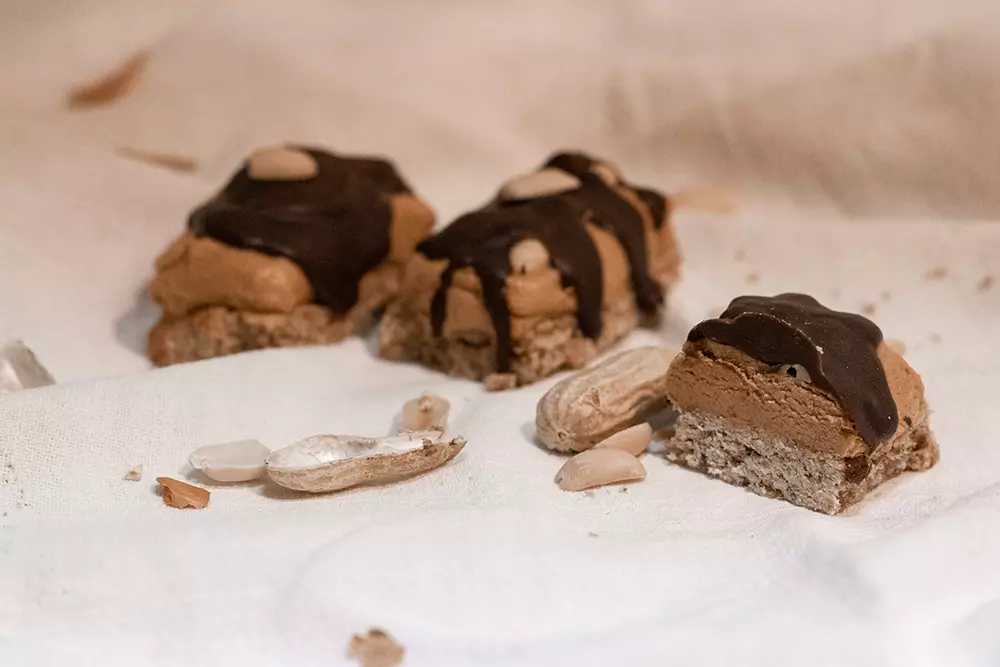 Druga plast: Vse sestavine zopet dobro premešamo. Masa mora biti kompaktna, da jo lahko oblikujemo. Karamelo razporedimo nad spodnjo plast in čez posujemo še arašide.