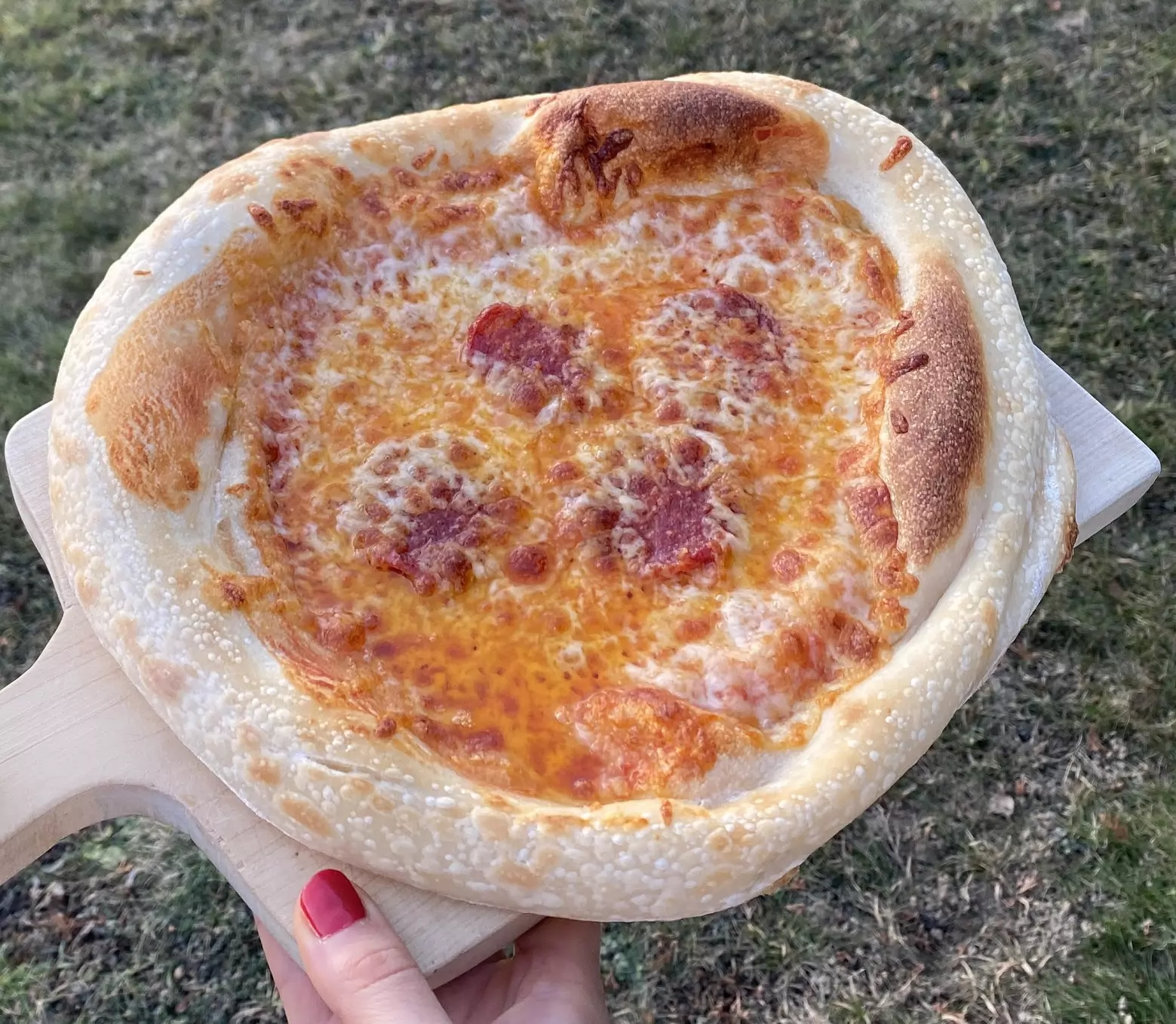 OPIS POSTOPKA: Moko stresemo v večjo posodo, na sredi izdolbemo luknjo in naredimo kvasec (pol kocke kvasa, sladkor, voda, žlica moke). Pustimo stati cca 10 minut, da kvasec malo vzhaja. Nato dodamo olje, malo soli na rob ter mlačno vodo. Vse skupaj dobro zgnetemo in testo pustimo počivati približno 1 uro. Po tem ko testo vzhaja ga razvaljamo in najprej namažemo s paradižnikovo mezgo. Po želji dodamo sol in ostale začimbe. Nato čez posujemo mozzarelo in salamo. Ko pizzo obložimo jo postavimo v že naprej segreto pečico na 200 stopinj Celzija. Pečemo približno 15 minut.
