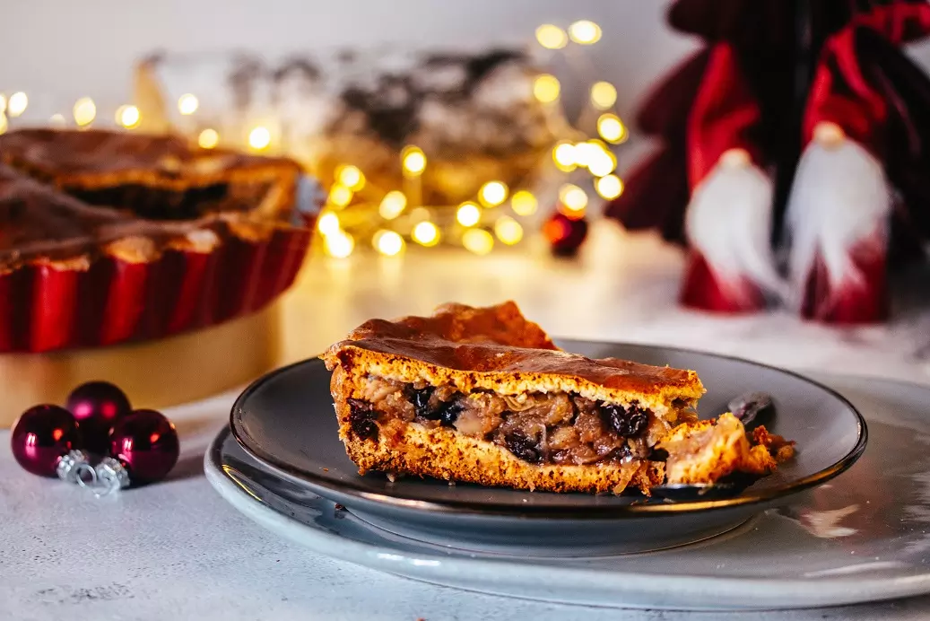 6. Iz preostalega testa izrežemo še krog, s katerim pokrijemo pito. Z vilico naredimo luknjice. Vrh pite po želji premažemo z beljakom ali jajčko.
