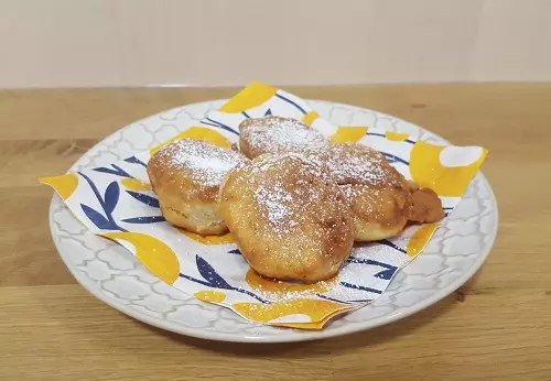 OPIS POSTOPKA: Jajce in sladkor zmiksamo z električnim ročnim mešalnikom. Dodamo vse ostale sestavine in zmiksamo toliko da nastane homogena zmes. Pustimo počivati 10-15 minut. Medtem segrejemo olje. Z dvema čajnima žličkama v segreto olje polagamo žličke zmesi. Cvremo jih do zlato rjave barve.