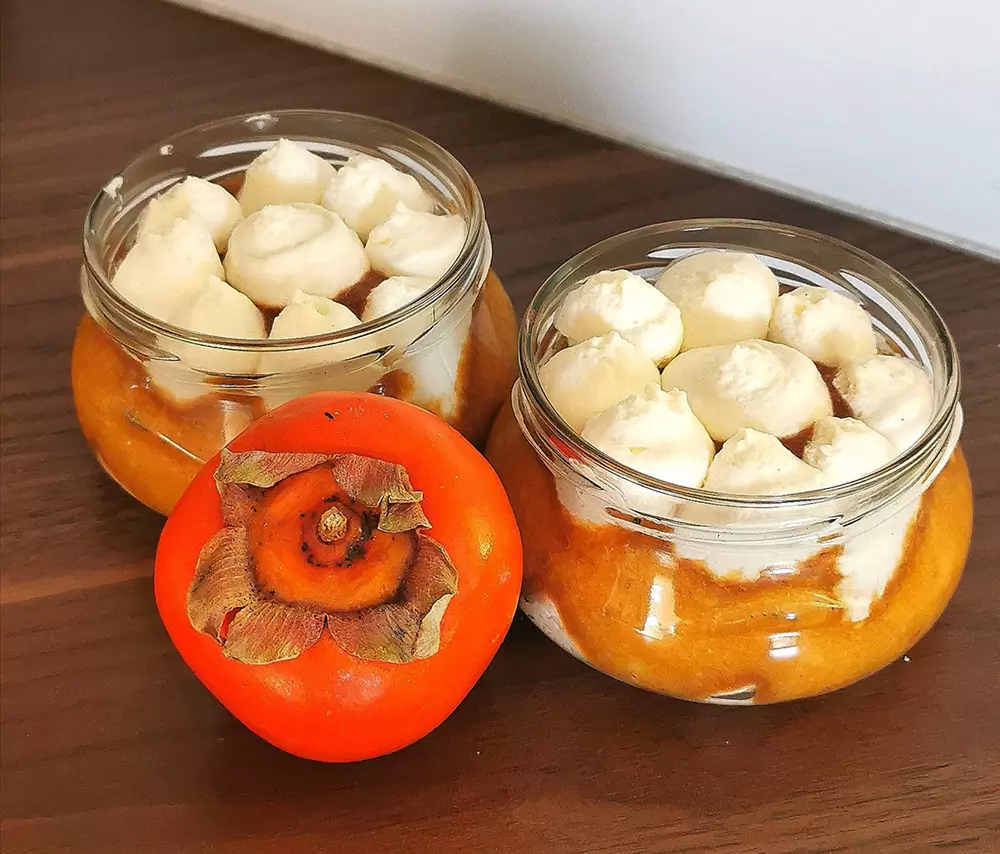OPIS POSTOPKA: Kakije olupimo, razkoščičimo in z električnim mešalcem spremenimo v pire. Sladko smetano stepemo skupaj z mascarponejem, vanilijevo pasto in sladilom po okusu - pazimo, da ne predolgo (saj lahko nastane maslo). V dva lončka za desert izmenično dodajamo kalijev pire in smetanovi mešanico (ki jo brizgamo z dresirno vrečko). Pustimo na hladnem do serviranje.