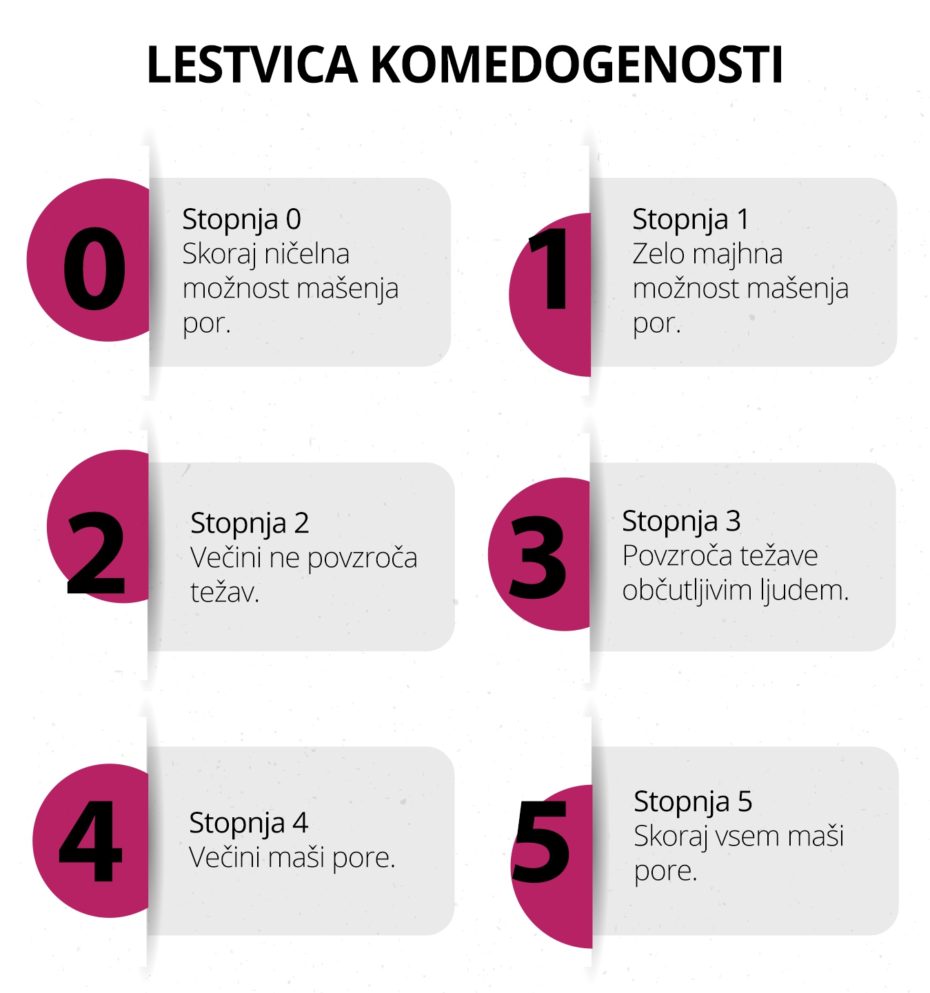 Najpreprostejša definicija je, da je komedogeno vse, kar maši pore in lahko vodi k ogrcem, aknam ter drugim kožnim nepravilnostim. Če se pore ne mašijo, potem gre za nekomedogeno snov.
