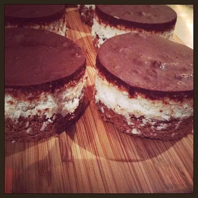 Nadev: Penasto umešamo jajca. Zavremo smetano in jo odstavimo. Ko se malo ohladi dodamo kokosovo moko, dobro premešamo, na koncu pa dodamo še ostale sestavine. Nadev namažemo na biskvit ter vse skupaj pečemo še 20 min na 180°C. Ko se tortice ohladijo jih premažemo čokoladnim prelivom.