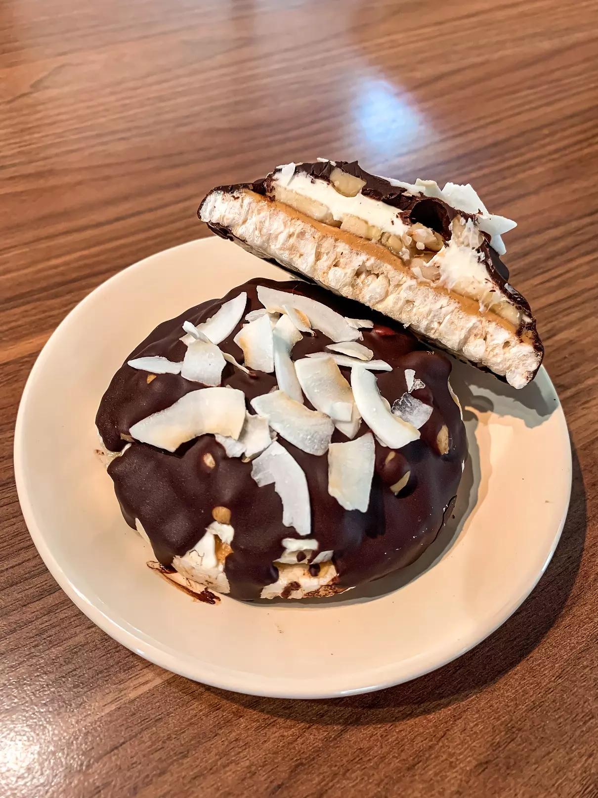 OPIS POSTOPKA: Najprej rižev vafelj namažemo z arašidovim maslom (1-2 žlički na vsak vafelj), nato dodamo na rezine narezano banano (lepo enakomerno razporedimo po vaflju), sledi sirni namaz (1-2 žlički na vsak vafelj). Po namazu dodamo arašide - enakomerno razporedimo. V vodni kopeli stopimo temno čokolado ter z njo lepo oblijemo nastali vafelj. Na koncu dodamo po vrhu še kokosove lističe. Postavimo v hladilnik, da se čokolada strdi in to je to!