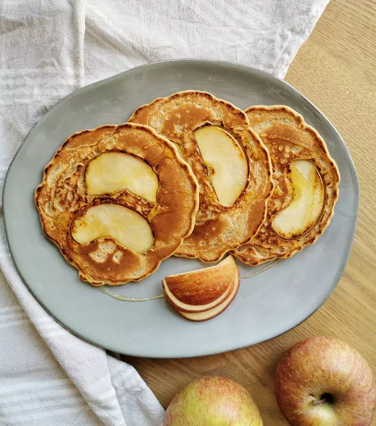 OPIS POSTOPKA: Jabolko prerežemo na polovico, izdolbemo košice in narežemo na tanke rezine. V večji skledi zmešamo jajci z mlekom, dodamo moko, mlete orehe ter kokosov sladkor, cimet in sol. Zmešamo v gladko zmes in dodamo še vanilijev ekstrakt po okusu. Ponev za palačinke namastimo s kapljico olivnega olja, počakamo minuto, da se olje segreje, nato pa na sredino ponve najprej položimo dve rezini jabolka in jih prelijemo z eno zajemalko zmesi. Ponev pokrijemo s pokrovko in palačinko obrnemo, ko zgornja stran ni več tekoča. Palačinko še 2-3 minute pečemo na drugi strani, nato pa jo odstavimo na krožnik in pričnemo z drugo. Palačike lahko postrežemo z medom, jabolčno sežano ali marmelado po izbiri.