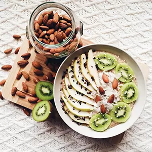 OPIS POSTOPKA: V kozici na zmernem ognju skuhamo ovsene kosmiče v razmerju 1:2 (1 skodelica ovsenih kosmičev, 2 skodelici vode). Ko so ovseni kosmiči kuhani jim dodamo nastrgano jabolko in cimet. Ovseno kašo prelijemo v servirno posodico, dodamo narezano hruško, kaki, kokosov čips in mandlje.