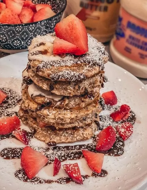 OPIS POSTOPKA: Vse sestavine dobro zmešaš, da nastane homogena zmes. Pazi na količino vode. Če jo dodaš preveč lahko to popraviš s konjak glukomananom ali pa dodaš še več chia semen. Dobro je da zmes pustiš tudi malo počivati preden se lotiš same peke palačink. Masa je primerna za približno 6 majhnih ameriških palačink. Nadev je lahko čisto poljuben, jaz sem uporabila arašidovo maslo, namaz iz bele čokolade ter jagode, ki so nepogrešljiva sestavina valentinovega. Za dodatno okrasitev jih lahko posuješ s kokosovo moko in preliješ s čokoladnim lešnikovim namazom. Če pripravljaš sladico zase in za partnerja pa predlagam, da količino podvojiš. Sladko sladkanje želim!
