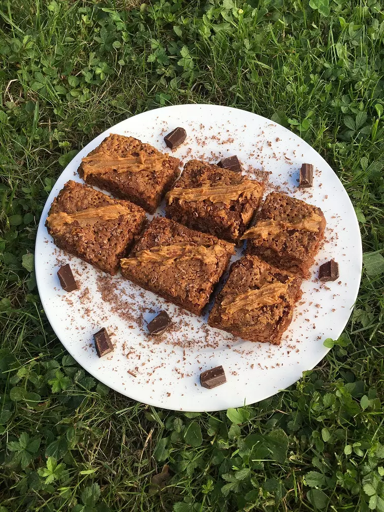 POSTOPEK: Najprej dobro zmešaj vse suhe sestavine in nato dodaj še preostale. Zmes, ki nastane, razporedi po majhnem pekaču in po vrhu dodaj še arašidovo maslo. Peci 20–25 minut na 180 stopinj Cezija.