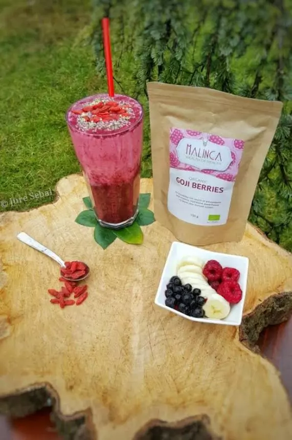 POSTOPEK: V mešalnik damo maline, 1 dcl jogurta, pol banane in pest goji jagod. Vse skupaj dobro zmiksamo. Tekočino prelijemo in damo na stran. Nato damo v mešalnik borovnice, 1 dcl jogurta in drugo polovico banane. Sestavine zopet dobro zmiksamo. Obe zmesi po slojih natočimo v velik kozarec, ter okrasimo z goji jagodami in oluščenimi konopljinimi semeni. Seveda lahko vse sestavine zmiksate naenkrat, če ne želite smootija v slojih.