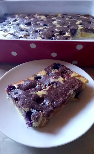 OPIS POSTOPKA: Jajca in eritritol penasto stepemo ter dodamo stopljeno kokosovo olje in mleko. Pecilni prašek pomešamo med moko in ju počasi dodajamo k zmesi, da dobimo gladko maso. Pekač namastimo in vanj vlijemo polovico mase. V preostanek mase vmešamo žlico presnega kakava. Sadje operemo in narežemo ter razporedimo po pekaču. Prelijemo s temno polovico mase. Pečemo na 180 stopinj, 30-40 min. Ko je pecivo pečeno in še vroče, ga prelijemo z mešanico mleka in ruma.