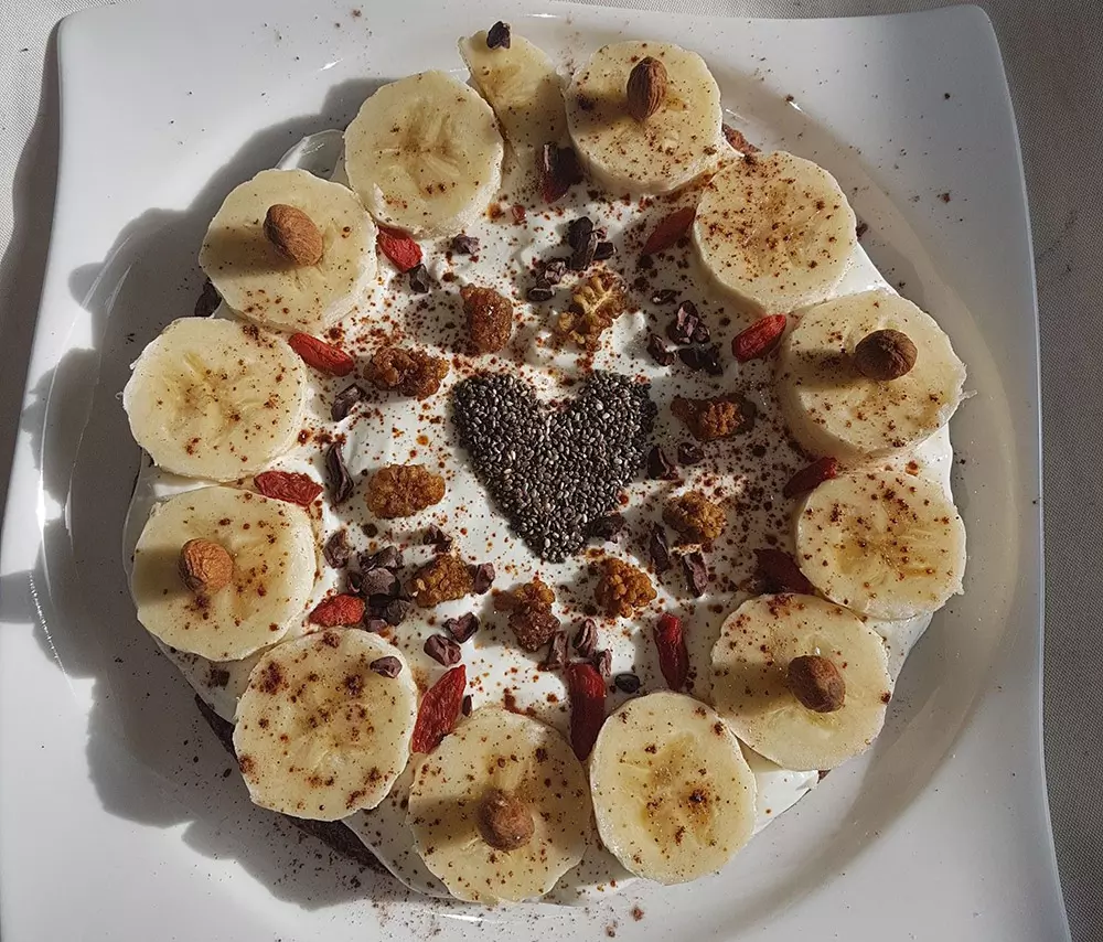 OPIS POSTOPKA: Jajco, banano, ovsene kosmiče, kakav in indijski trpotec dobro premešamo, da nastane gosta masa. Z rokami oblikujemo ''pizzo'', ter jo pečemo na 180°C 15minut. Ko je testo pečeno, ga ohladimo in premažemo z grškim jogurtom ter skuto. Preko nadevamo poljubno sadje, oreščke, chia semena.