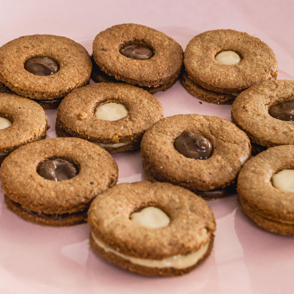 Nato testo razvaljamo. Testo je zelo mastno in se rado lomi pri valjanju, a s tem ni nič narobe. Oblikujemo s poljubnimi modelčki. Jaz sem uporabila za polovico mase kroge in za drugo polovico kroge z luknjico, ker smo potem piškote sestavljali skupaj. V pečici, predhodno ogreti na 180 stopinj, pečemo piškote 12 minut. Ko se piškoti ohladijo, dodamo na vsak krogec žličko poljubnega namaza in prekrijemo z drugim krogcem z luknjico.