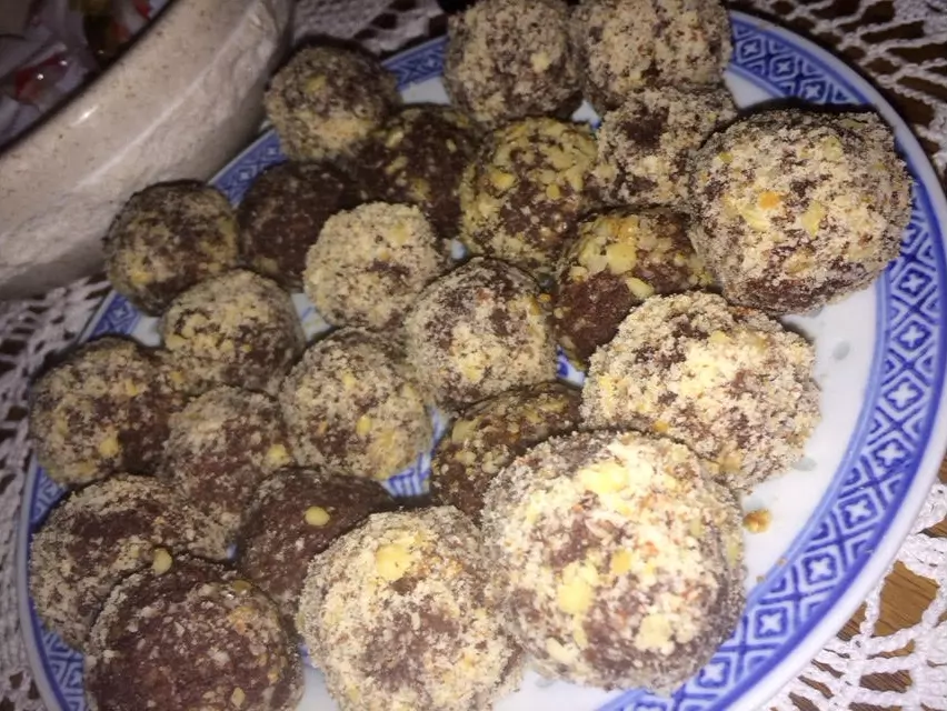 OPIS POSTOPKA: Datlje namočimo v vreli vodi (pustimo jih pribl. 1 uro). Lešnike popražimo v pečici in jih, ko se ohladijo, zmeljemo jih v multipraktiku čisto na drobno. Datlje odcedimo in jih prav tako zmeljemo v multipraktiku, da dobim datljevo pasto. V datljevo pasto dodamo ščepec soli in kakav v prahu, dobro premešamo in na koncu dodamo mlete pražene lešnike. Dodajamo dokler ne dobimo kompaktne mase za izdelavo kroglic. Iz mase oblikujemo kroglice in vsako povaljamo v drobno sesekljanih praženih lešnikih. Kroglice damo v hladilnik za vsaj pol ure, da se strdijo.