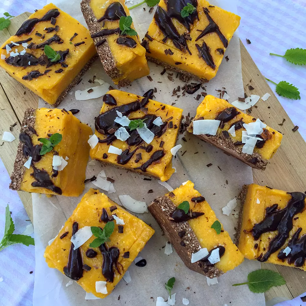 OPIS POSTOPKA: Vse sestavine za podlago zmiksamo v zmogljivem multipraktiku. Zmesi po potrebi dodamo kakšno žlico vode. Nato jo razporedimo po pekaču, obloženem s papirjem za peko in dobro potlačimo. Postavimo v zamrzovalnik. Za kremo zmeljemo namočene indijske oreščke, meso manga, razkoščičene datlje, limonin sol, vaniljo, sol in stopljeno kokosovo olje. Gladko zmes razporedimo čez podlago in postavimo v zamrzovalnik za 2-3 uri. Ko rezine vzamemo iz zamrzovalnika počakamo 5 minut, nato pa jih narežemo, prelijemo z stopljeno temno čokolado, potresemo s kokosovim čipsom in okrasimo z listki mete.