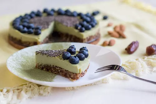 Nato skuhamo puding. Vzamemo 1 deciliter manj mleka, kot piše v navodilih z embalaže, da bo bolj kompakten. Segrejemo 3 decilitre mleka, 1 deciliter pa zmešamo skupaj s prahom za puding in ko je dovolj gladek, ga vmešamo v mleko ter pokuhamo, da se zgosti. Ko je puding skuhan vmešamo agavin sirup in matcha prah. Puding nato zlijemo v pekač na tortno dno. Po vrhu razporedimo borovnice in posipamo s chia semeni. Torto pustimo stati, da se puding ohladi, nato pa jo lahko shranimo v hladilnik.