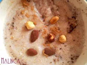 OPIS POSTOPKA: Zavremo ovseno mleko in dodamo polnozrnat pirin zdrob. Ob zmernem ognju kuhamo in ves čas mešamo približno 5 minut, lahko tudi dlje – odvisno od želene gostote. Ko odstavimo, dodamo kakav v prahu, cimet, žličko kokosove moke, po vrhu pa potresemo (lahko cele ali zmlete) oreščke, ki jih imamo pri roki.