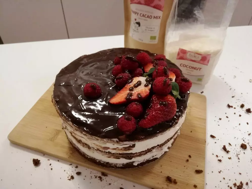 Preliv: Čokolado narežemo na manjše koščke in jo na vodni pari stopimo z žličko kokosovega olja ter malo mleka. Čokolado prelijemo čez torto ter jo okrasimo z jagodami in malinami.