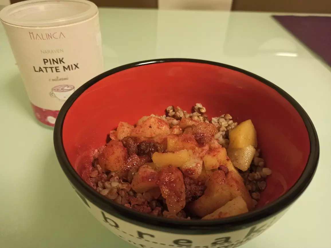OPIS POSTOPKA: Ajdovo kašo skuhamo po navodilu na embalaži. Sadje (jabolko, hruško ali kombinacijo ter rozine) skuhamo posebej do mehkega. Na koncu v kuhano sadje dodamo chia semena, da se zmehčajo, ter cimet. V skodelico damo kuhano ajdovo kašo ter sadje, na vrh potresemo žličko Pink latte mixa. Dober tek!