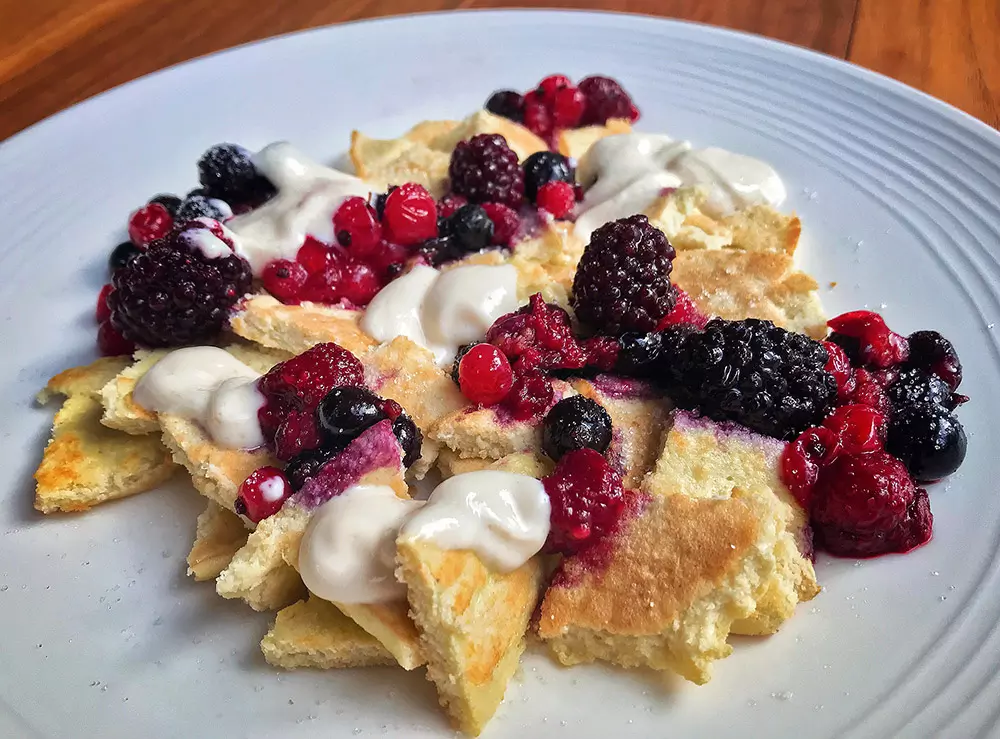 Šmorn predenemo na krožnik, izdatno posujemo s cimetom, prelijemo z žlico medu in toplimi gozdnimi sadeži. Za kontrast se prileze par žlic hladnega jogurta po izbiri.