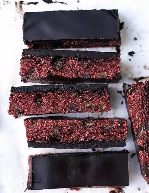 OPIS POSTOPKA: Mandljevo moko, kokosovo moko, liofilizirane jagode in sol zmelji v prah. Stopi kokosovo olje in zmešaj skupaj z maslom iz oreščkov, javorjevim sirupom in vanilijevim ekstraktom. K temu dodaj še mešanico mok in dobro zmešaj. 50 g ćokolade nareži na koščke in dodaj k masi. Majhen pekač premera okoli 10x18 cm obloži s peki papirjem in nato vanj razporedi vso maso. Postavi v hladilnik ali zamrzovalnik za 10 minut. Medtem stopi 100 g čokolade z žličko kokosovega olja. Čokolado razporedi po vrhu mase in postavi v hladilnik ali zamrzovalnik za 10 minut, da se strdi. Razreži na 6 kosov.